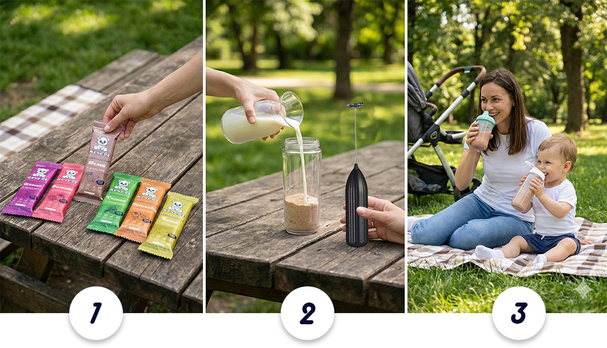 2. Добави вода или мляко – Разбий с преносимо миксерче за гладка консистенция.